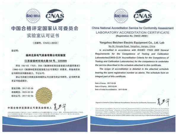2017年2月6日,揚州北辰電氣設備有限公司實驗室獲得了中國合格評定國家認可委員會(CNAS)頒發(fā)的實驗室認可證書。